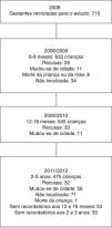 MétodoO estudo constituiu‐se de coorte aninhada a ensaio de campo randomizado, que ocorreu entre abril de 2008 e maio de 2012, com mães e crianças acompanhadas desde os seis meses aos 2‐3 anos de idade. A fase de recrutamento ocorreu durante o terceiro trimestre da gestação, em unidades de saúde das oito áreas distritais de Porto Alegre, Brasil. Em todas as fases, a equipe de coleta de dados foi composta por aproximadamente vinte membros, nutricionistas e acadêmicos de nutrição, previamente capacitados. As equipes foram distribuídas de acordo com a região distrital, sendo a coleta realizada sempre por, no mínimo, dois membros da equipe.