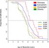 In the Cox model, adjusted for age, the crude hazard ratio (95% CI) in obesity was 2.05 (1.49, 2.81), overweight 1.59 (1.28, 1.97), and in thinness 0.41 (0.10, 1.68). After adjusting for race and socioeconomic level as covariates, the hazard ratio (95% CI) in obesity was 2.17 (1.55, 3.03), overweight 1.66 (1.32, 2.08), and thinness 0.9 (0.09, 1.61).