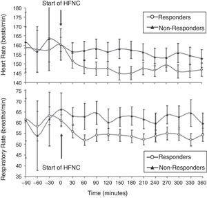 Heart rate (top) and respiratory rate (bottom) over time in infants with acute viral bronchiolitis. A notable reduction in heart rate and respiratory rate at 60min following initiation of HFNC support separates responders from non-responders in this cohort. Adapted from Schibler et al.27